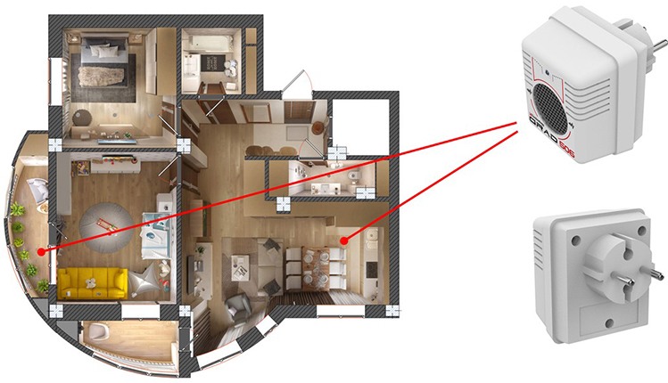 - Большая площадь отпугивания — до 500 кв. м. Устройство обладает высокой постоянной мощностью излучения и способно прогнать вредителей не только из небольших помещений (жилых комнат, чердаков, сараев, погребов, гаражей), но и с производственных объектов (складов, ангаров и т.п.).